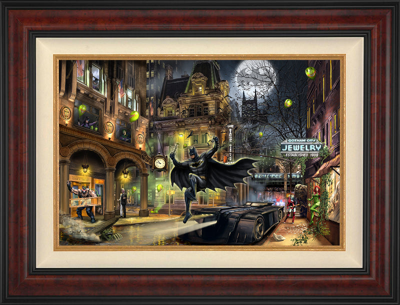 Since its inception, Gotham City has been overrun with crime and corruption, and immortalized as a dark, foreboding city. As the years went by, Gotham City seemed to dive deeper and deeper into darkness, but from that darkness arose one of DC’s greatest Super Heroes: Batman. In Batman™ Gotham City™ by Thomas Kinkade Studios, Batman jumps off the Batmobile parked on a Gotham City Street, as he is responding to the Bat-Signal. Every night in this metropolis provides an electrifying new battle against evil, and this painting captures the excitement and danger that accompanies Batman in his quest to rid the notorious city of crime.