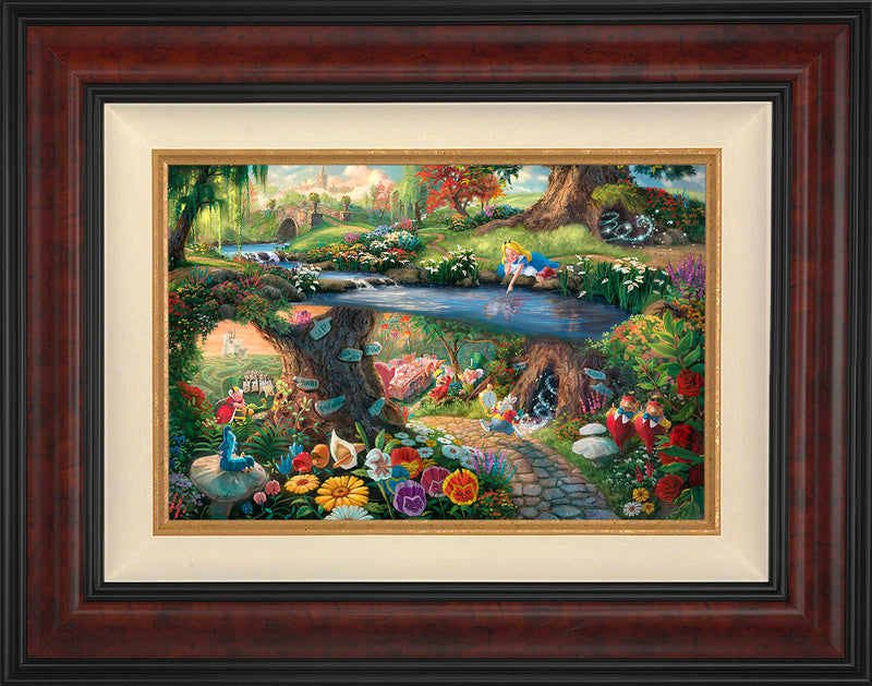 The story tells of a young girl named Alice who accidentally falls down a rabbit hole and finds herself on a curious adventure and in the presence of a number of odd and interesting characters. In 1951, Walt Disney realized a long-held ambition and brought this enchanting tale to the big screen, infusing it with his own brand of animated magic and family fun. Disney Alice in Wonderland as illustrated by John Tenniel was exquisitely detailed in the book, while the Disney film was a modernist style with a highly saturated color palette. The Thomas Kinkade Studios painting of Disney Alice in Wonderland captures all the great Disney characters. The hurried White Rabbit, the enigmatic Caterpillar, the lunatic Mad Hatter, the nonsensical Tweedledee and Tweedledum all play a part in the world down the hole. There is also Alice, viewing it all with a child's innocence and relating to it in a way that brings out the wonderment in all of us. It is with a great deal of pride that we present the Thomas Kinkade Studios painting Disney Alice in Wonderland inspired by the literary genius of Lewis Carroll and animated mastery of Walt Disney.