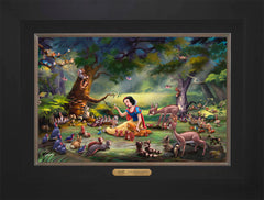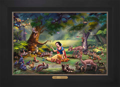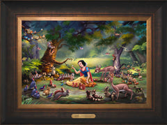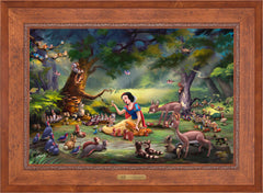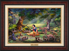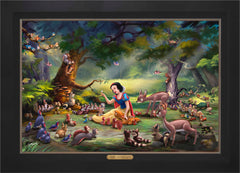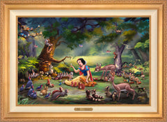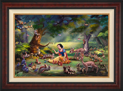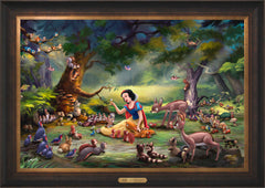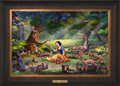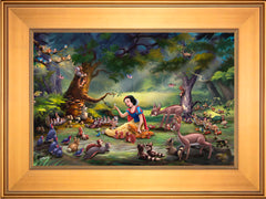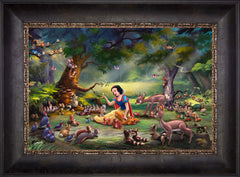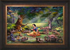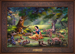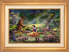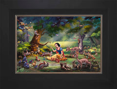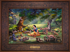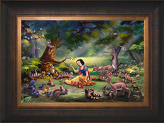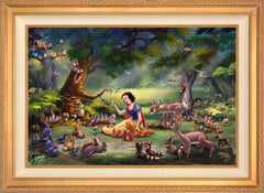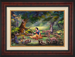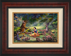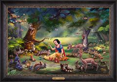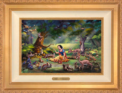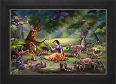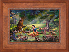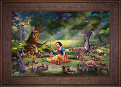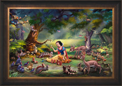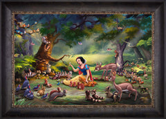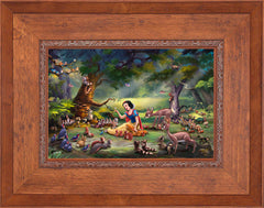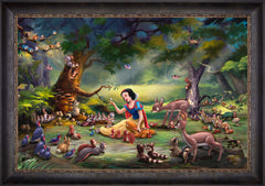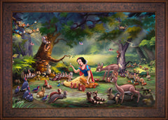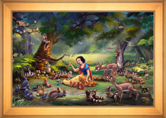 In Disney’s Snow White - Forest Secrets we find a gentle soul, having found refuge and acceptance in the depths of an ancient woodland after fleeing into the wilderness, alone and afraid. She discovers that kindness transcends species. The forest creatures—from the smallest chipmunk to the graceful deer—sense her pure heart and gentle spirit. They gather not as mere animals, but as friends and protectors. The warm, dappled sunlight filtering through the canopy suggest the dawn of a new adventure. Birds perch attentively in the gnarled branches above, while rabbits, raccoons, squirrels, and fawns form a circle of companionship around her. Each creature contributing to the moment: some listen intently, others play nearby, and still others keep watchful guard. This is a story about finding family in unexpected places, about how compassion creates community, and how the natural world responds to those who approach it with an open heart. It's a reminder that home isn't always where we start, but where we're truly seen and embraced for who we are. In this misty forest clearing, surrounded by her woodland friends, she has found something precious: belonging.