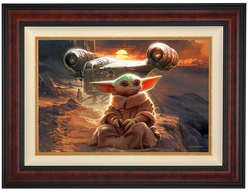 Grogu sits contemplatively against the backdrop of a dramatic alien landscape. Behind him, the silhouette of the Razor Crest™, its distinctive dual engines glowing softly against the rocky terrain. In the distance, a cloaked figure can be seen walking toward the ship, suggesting the presence of The Mandalorian™, Grogu's protector and companion on their journey. Capturing a moment of quiet reflection amid the vastness of space, embodying the spirit of adventure and the unique bond between these characters as they navigate the dangers and wonders of a galaxy far, far away..